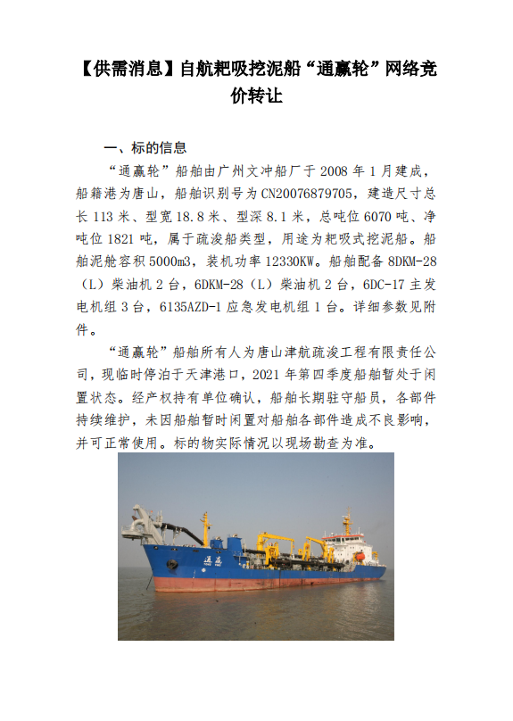 【供需消息】自航耙吸挖泥船“通赢轮”网络竞价转让.pdf