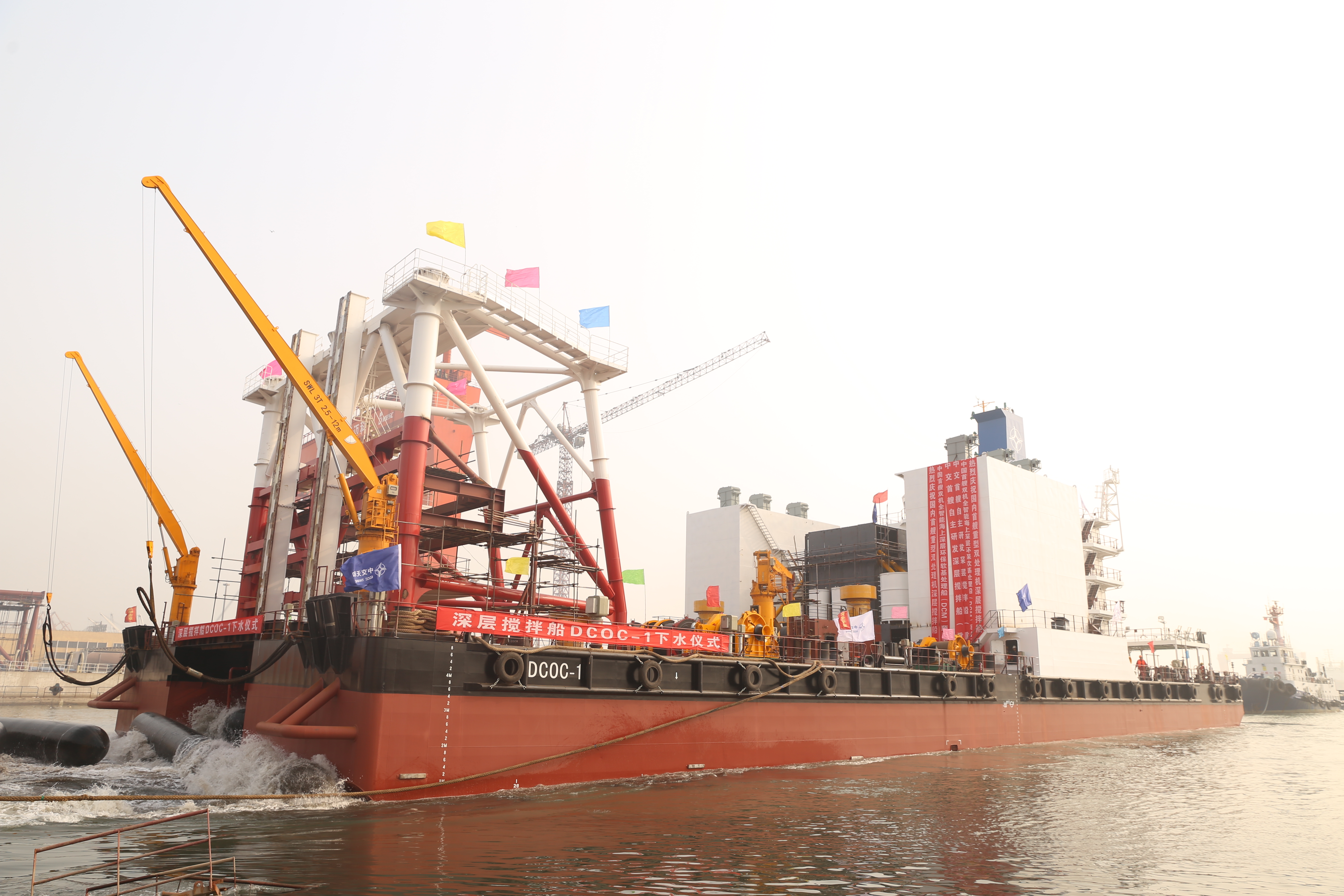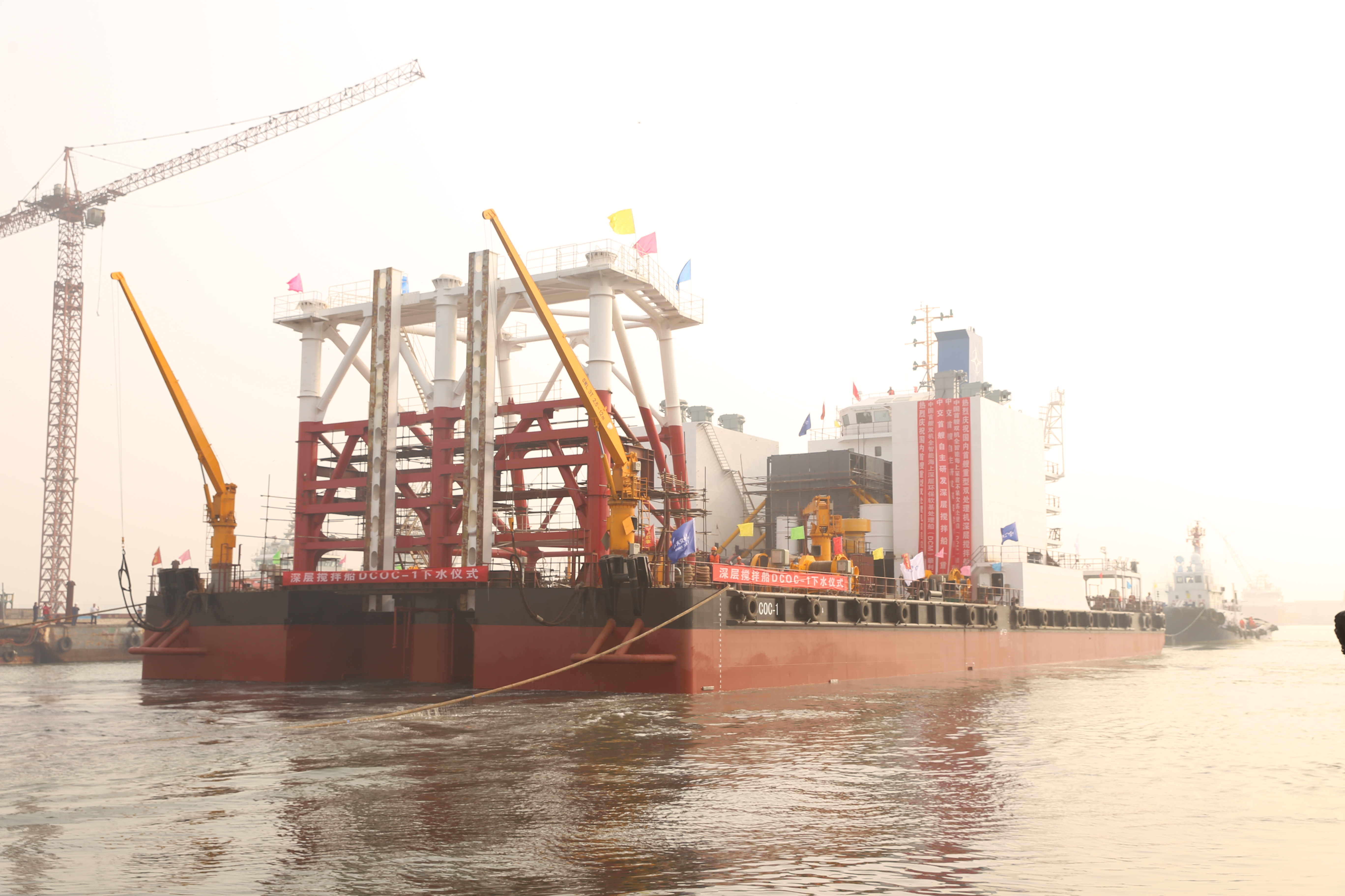 此次下水的深层水泥搅拌船在国际上首次采用了重型双处理机设置,是集深层土体切削搅拌、水泥浆精准注入、智能化施工管理等多项高端技术于一体的绿色环保型国际先进装备。该船的调倾系统、移船定位系统、水泥浆注入系统和抱桩器系统等,特别是智能化施工管理系统,一举打破了日、韩等国在该领域的技术垄断,并填补了国内空白,在这次海外项目投入使用,代表中国装备制造首次在这一领域“走出去”参与国际竞争。