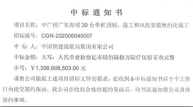 7月7日,中国铁建港航局集团有限公司新能源项目指挥部中标中广核广东海域30台单桩预制、施工和风机安装集约化施工工程,中标金额13.06亿元。一个月内,新能源项目指挥部连续承揽2项中广核海上风电项目,合计15.45亿元。