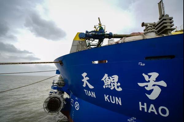 位于长江入??诘慕掌舳肮ひ翟澳?,一艘钢铁巨轮静静地停泊在这里,船身上三个大字“天鲲号”格外醒目,这就是有“造岛神器”美誉的具有中国自主知识产权的亚洲最大重型自航绞吸挖泥船。