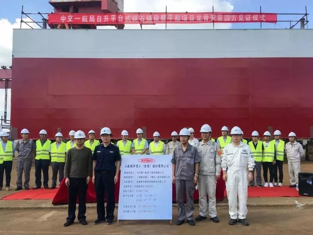 9月28日,中交一航局自升平台式碎石铺设整平船在振华海工平台事业部举行龙骨安装四方见证仪式。中交一航局、振华重工、南通海事局、中国船级社江苏分社的代表一同见证了龙骨安装。