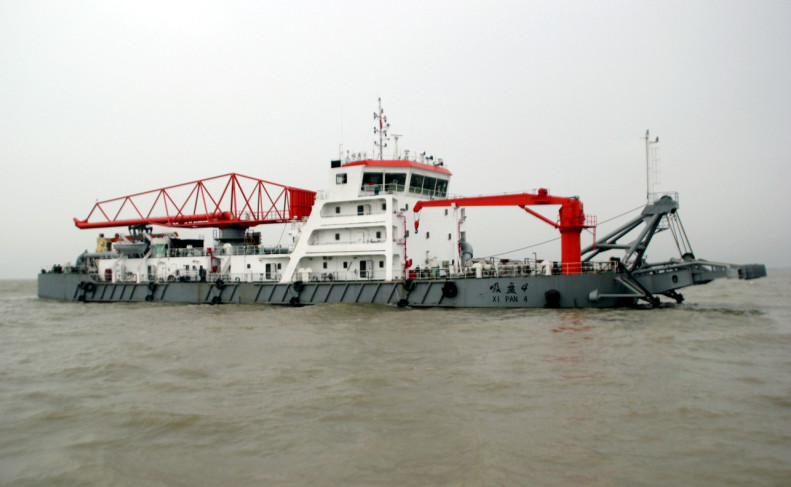 由长江航道局投资建造的“吸盘4”号为全电动自航吸盘挖泥船,采用钢质、单甲板、全电焊结构、双全回转舵桨、方尾浅吃水肥大船型。采用柴油机驱动发电机的全电动动力装置形式。配置三台柴油机驱动的1600kW发电机组并联运行组成统一的电站,作为全船动力设备的动力源。并配置一台215kW停泊发电机组。舵桨形式为卧式变频电机驱动的带导流罩全回转定距舵桨。设计航区为内河A级航区(含三峡库区,不含急流航段)。主要用于长江A、B、C级航区(含三峡库区,不含急流航段)疏浚作业。船体长约88.6米,型宽约15米,型深4.8米,满载吃水2.6米,调遣航速不小于10节。