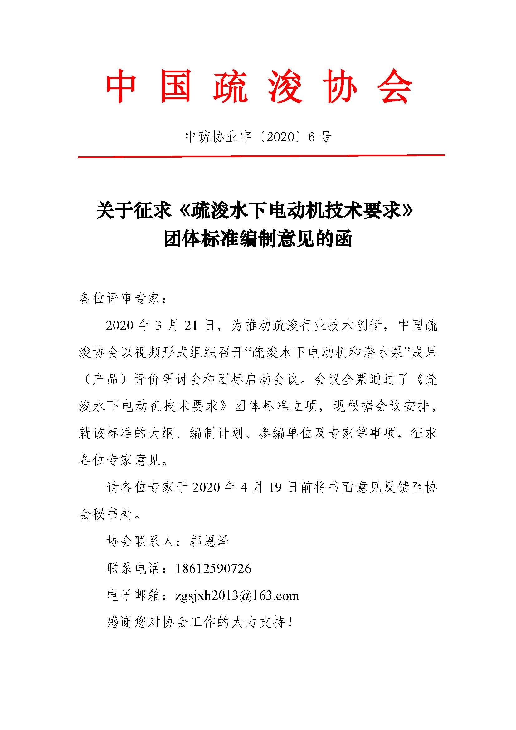 关于征求“疏浚水下电动机技术要求”团体标准编制意见的函