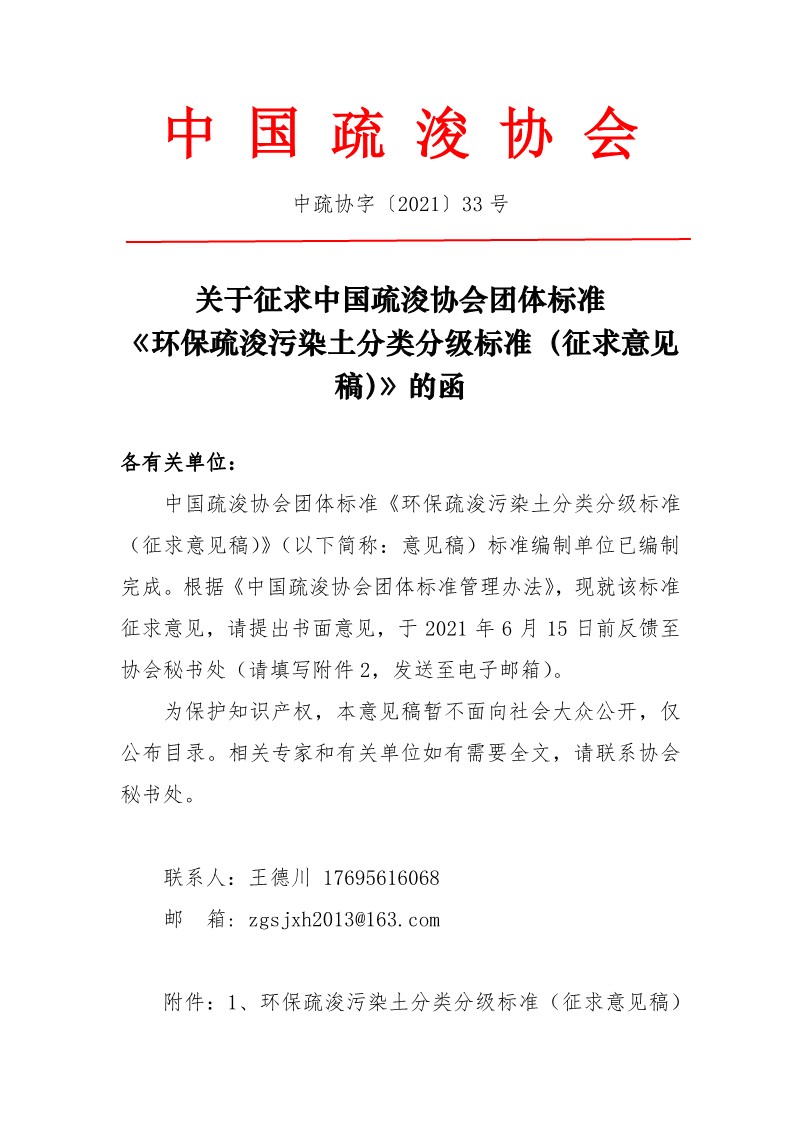 关于征求中国疏浚协会团体标准《环保疏浚污染土分类分级标准(征求意见稿)》的函