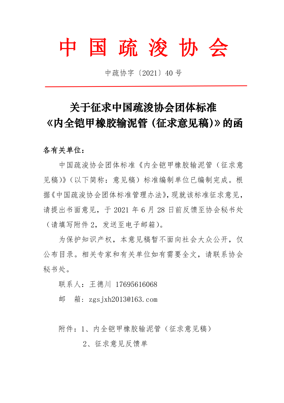 关于征求中国疏浚协会团体标准《内全铠甲橡胶输泥管(征求意见稿)》的函