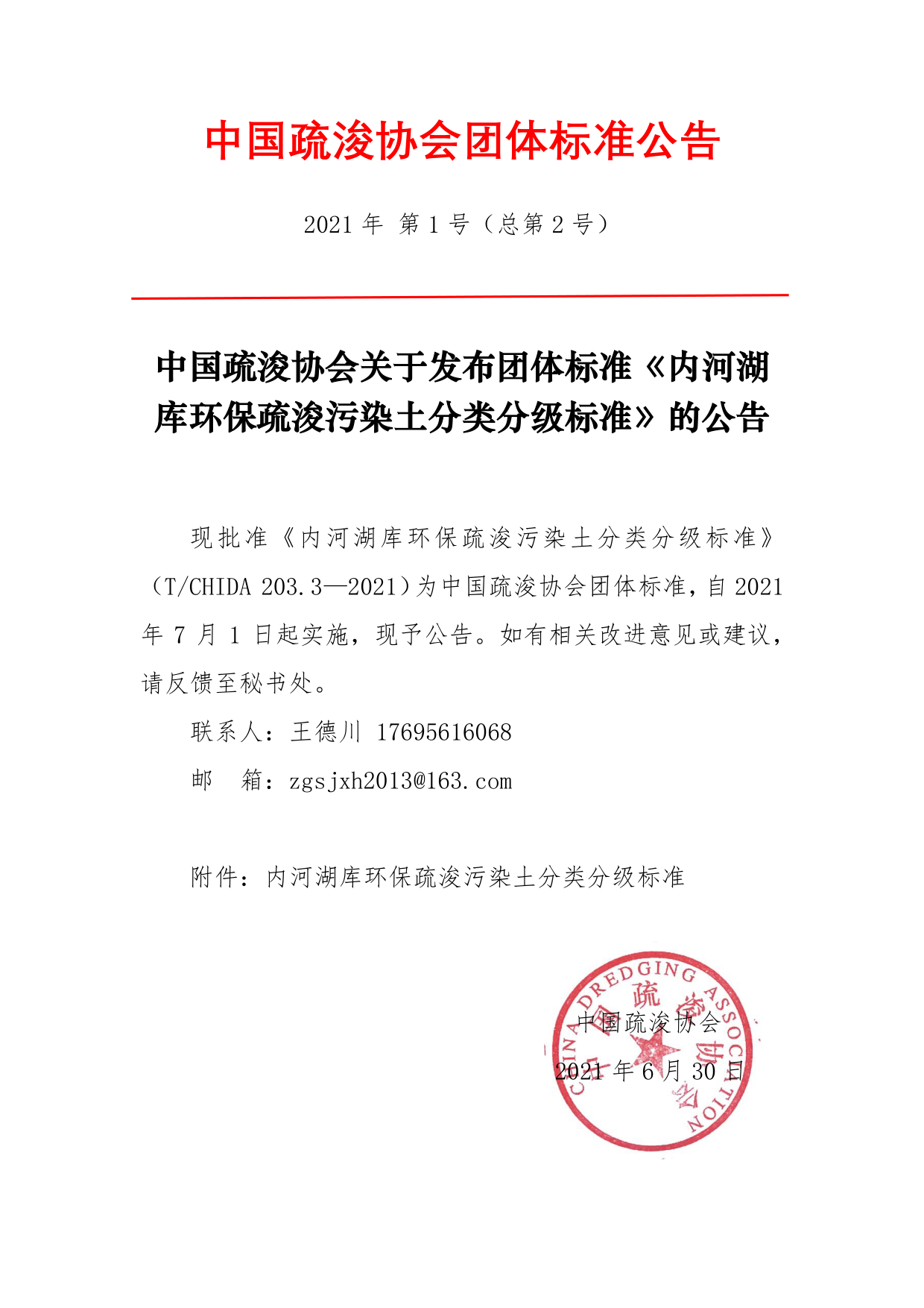 中国疏浚协会关于发布团体标准《内河湖库环保疏浚污染土分类分级标准》的公告