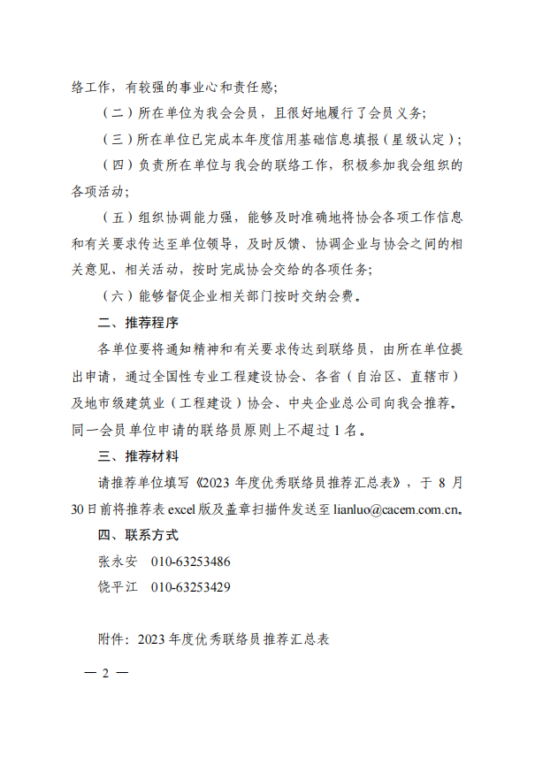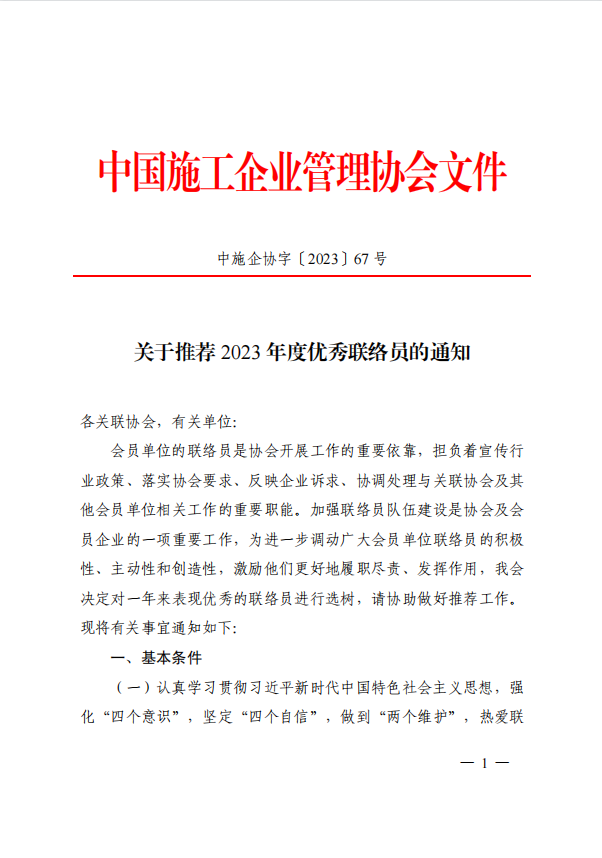 关于推荐2023年度优秀联络员的通知- 中施企协字〔2023〕67号