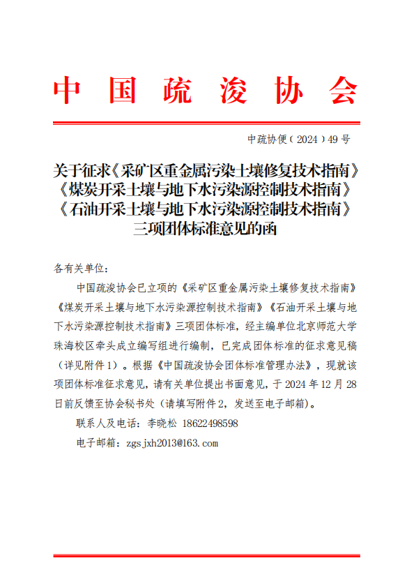 关于征求《采矿区重金属污染土壤修复技术指南》《煤炭开采土壤与地下水污染源控制技术指南》《石油开采土壤与地下水污染源控制技术指南》三项团体标准意见的函