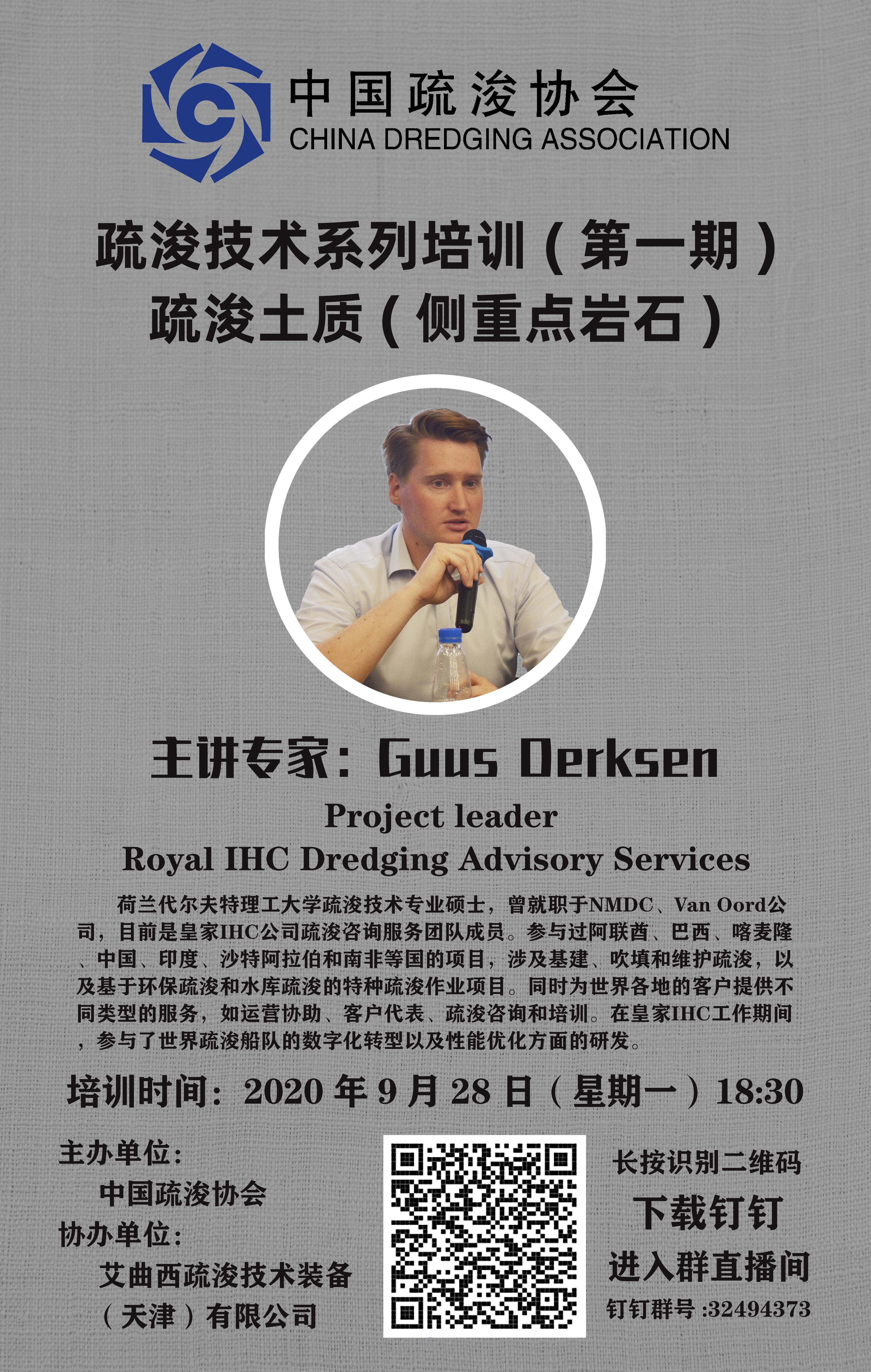 为进一步推动疏浚行业稳定健康可持续发展,普及疏?;≈?,提升疏浚从业者专业水平,中国疏浚协会计划举办疏浚知识系列培训,第一期第三讲为疏浚土质(侧重点岩石),由Royal IHC公司疏浚咨询服务部项目负责人Guus Derksen担任主讲专家,敬请大家准时参加。